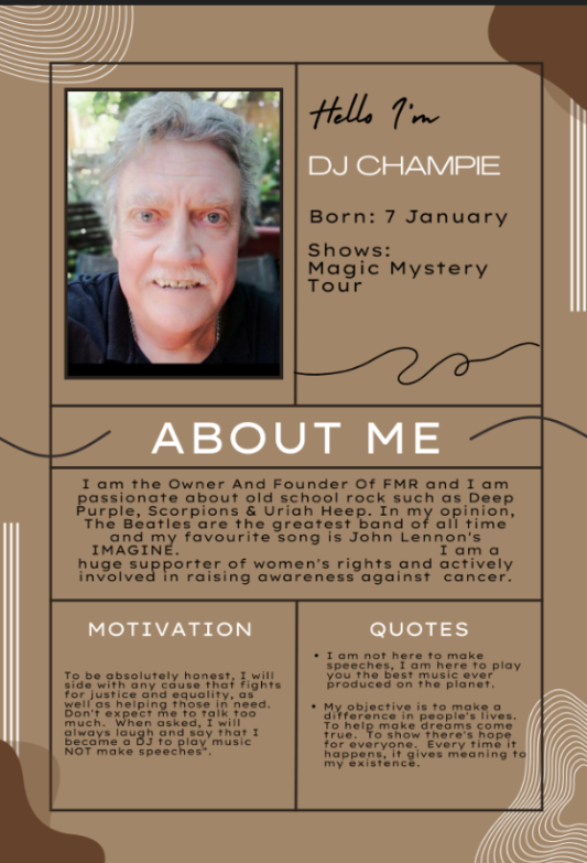 Champie is a music aficionado. After collecting LP's and learning all there is to know about contemporary music for decades, free lancing for years on various other Internet Radio Stations, Champie decided to start his own radio station in October 2023.