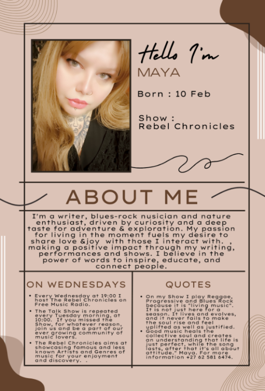 Maya is a musician, writer and now your radio talk-show host every Wednesday night on FMR. Maya first joined the FMR team as the designer of its logo and letterhead, Website designer, and advertising consultant. She now also manages FMR's Tiktok page and website.